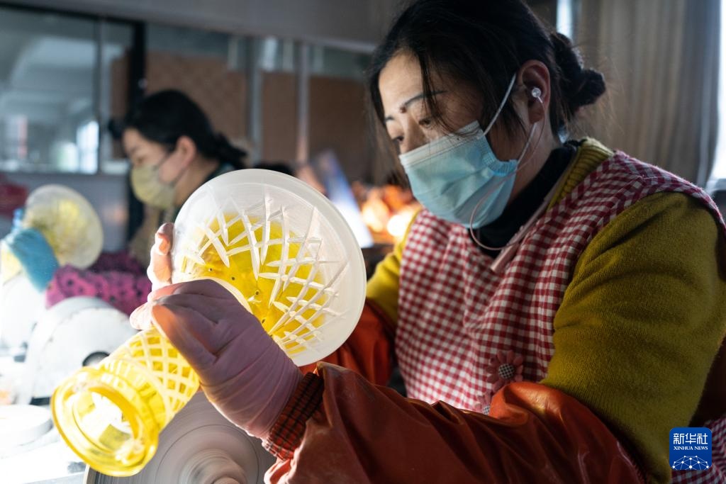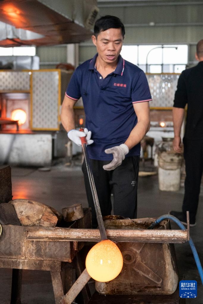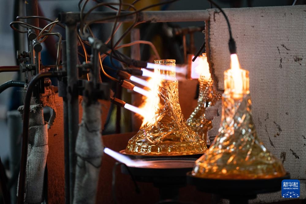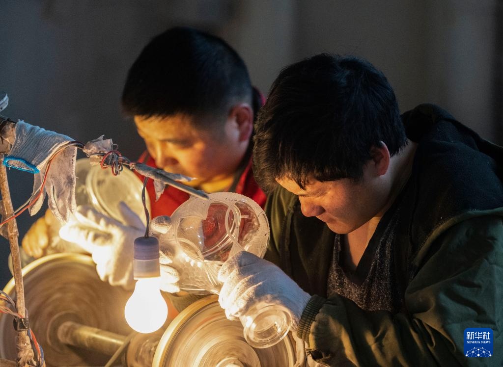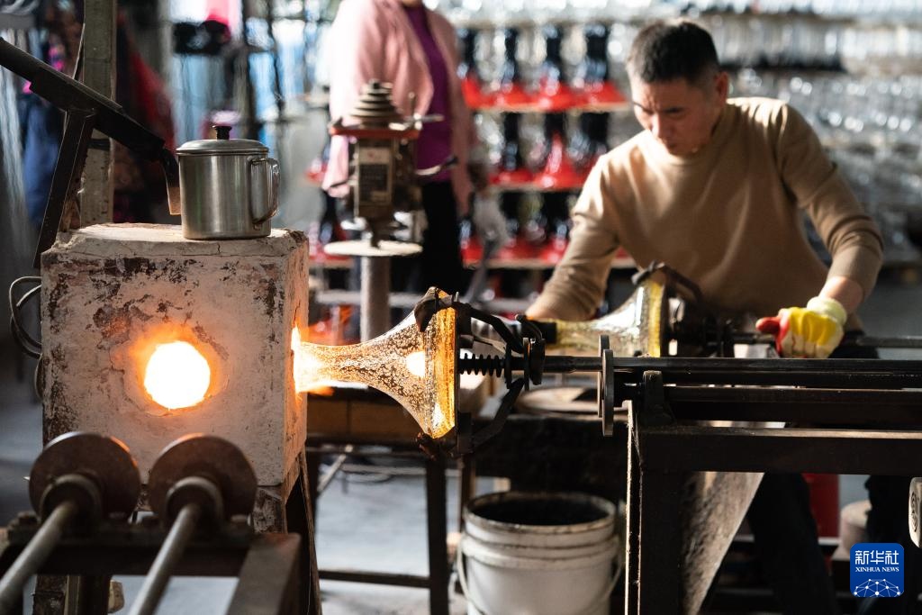 在安徽省天长市石梁镇石峰玻璃有限公司工厂,工人在制造水烟壶(1月14日摄)。